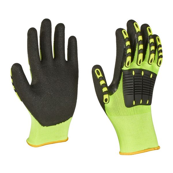 Impact shielded seamless cut resistant high visibility nitrile dipped gloves. A pair of comfortable gloves with excellent dexterity, enhanced grip.